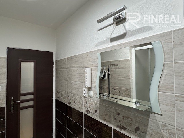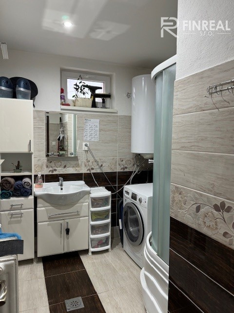Kúpeľňa s nábytkom, zabudovaným umývadlom, sprchový kút, príprava na práčku, elektrický bojler