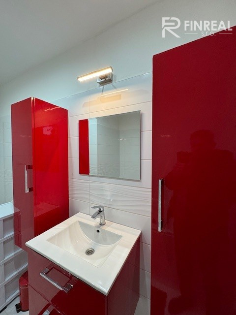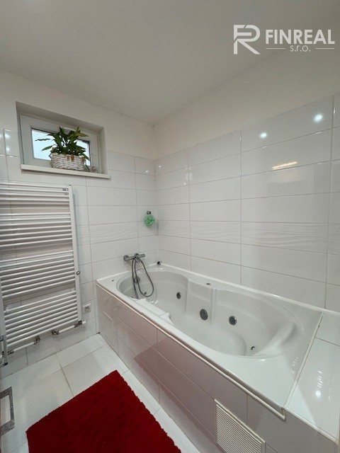 Kúpeľňa s nábytkom, zabudovaným umývadlom, masážna vaňa